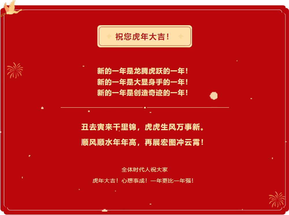 我們懷著熱切的渴望迎接虎虎生風(fēng)的新的一年。新年的發(fā)展藍(lán)圖已經(jīng)鋪開,全體時(shí)代人將躍躍欲試奔赴新的征程!新的戰(zhàn)場(chǎng)!