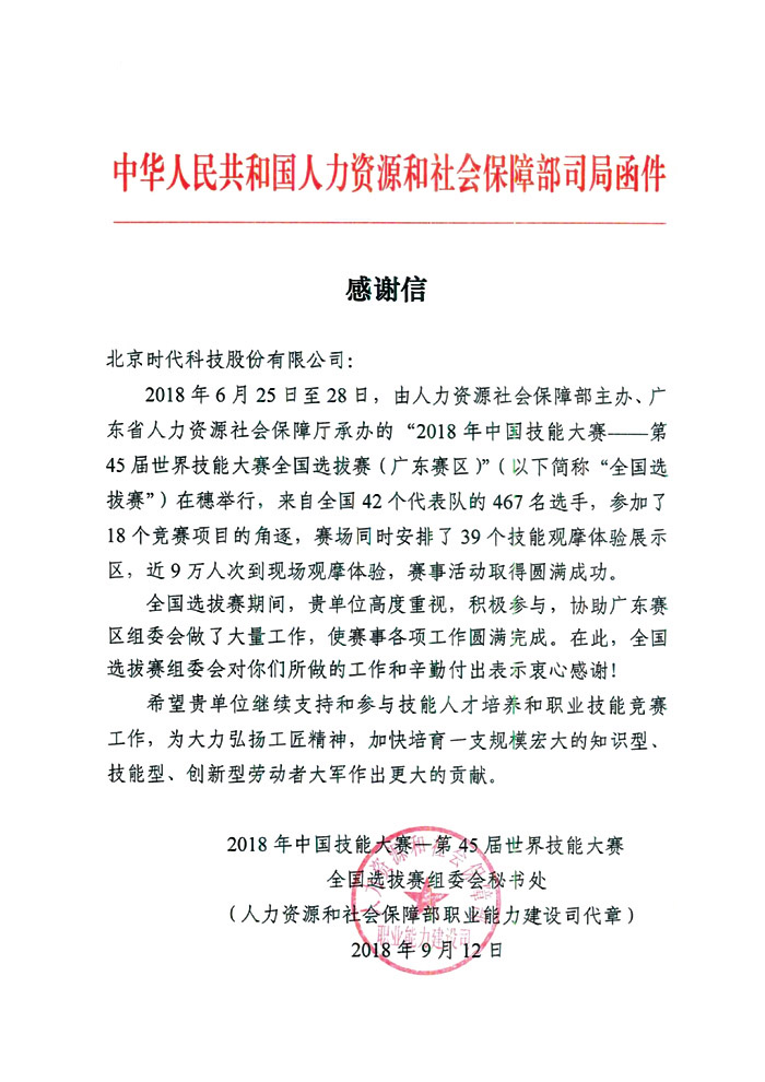 2018-09 第45屆世界技能大會全國選拔賽 組委會感謝信 中國人力資源和社會保障部職業能力建設司
