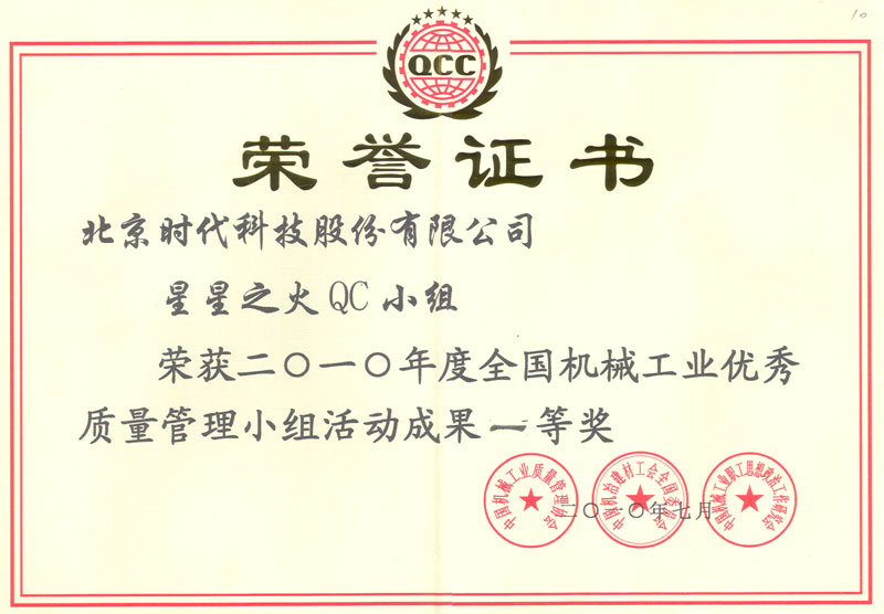 2010-07 全國機械工業優秀質量管理小組活動成果一等獎 中國機械工業質量管理協會