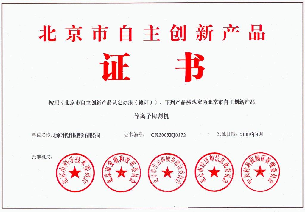 2009-04 北京市自主創新產品(等離子切割機) 北京市科學技術委員會
