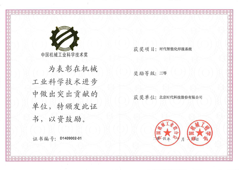 2014-12 中國機械工業科學技術獎 時代智能化焊接系統 中國機械工程學會