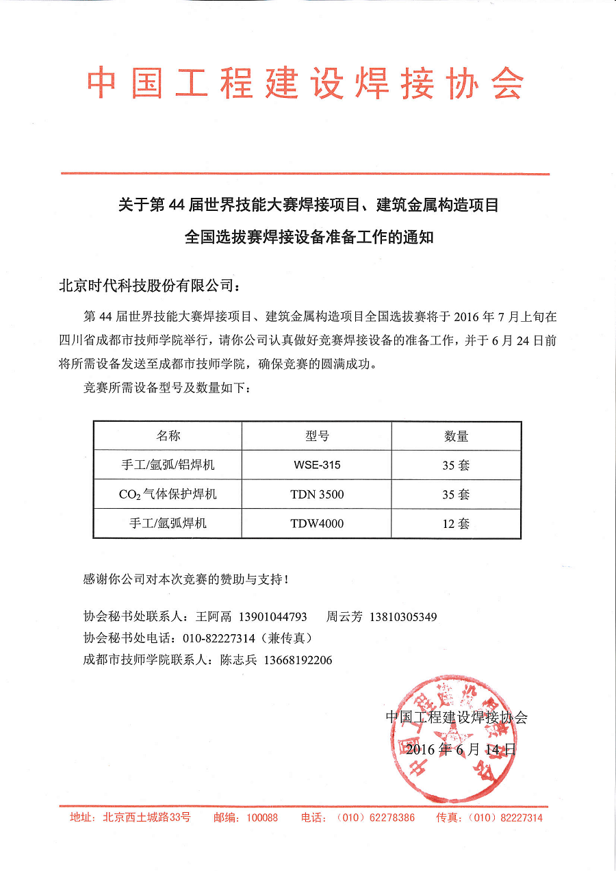 2016-06 第44屆世界技能大賽焊接項目、建筑金屬構造項目全國選拔賽唯一指定用機 中國工程建設焊接協會